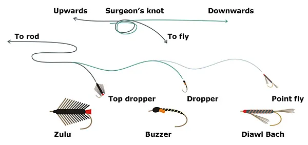 I've used this rig, with as top fly a big sedge as attractor, a diawl back as middle dropper-nymph and an buzzer as pointfly. It worked well (I only once threw everything in a enormous knot...). Caught two rainbows in a few minutes time.